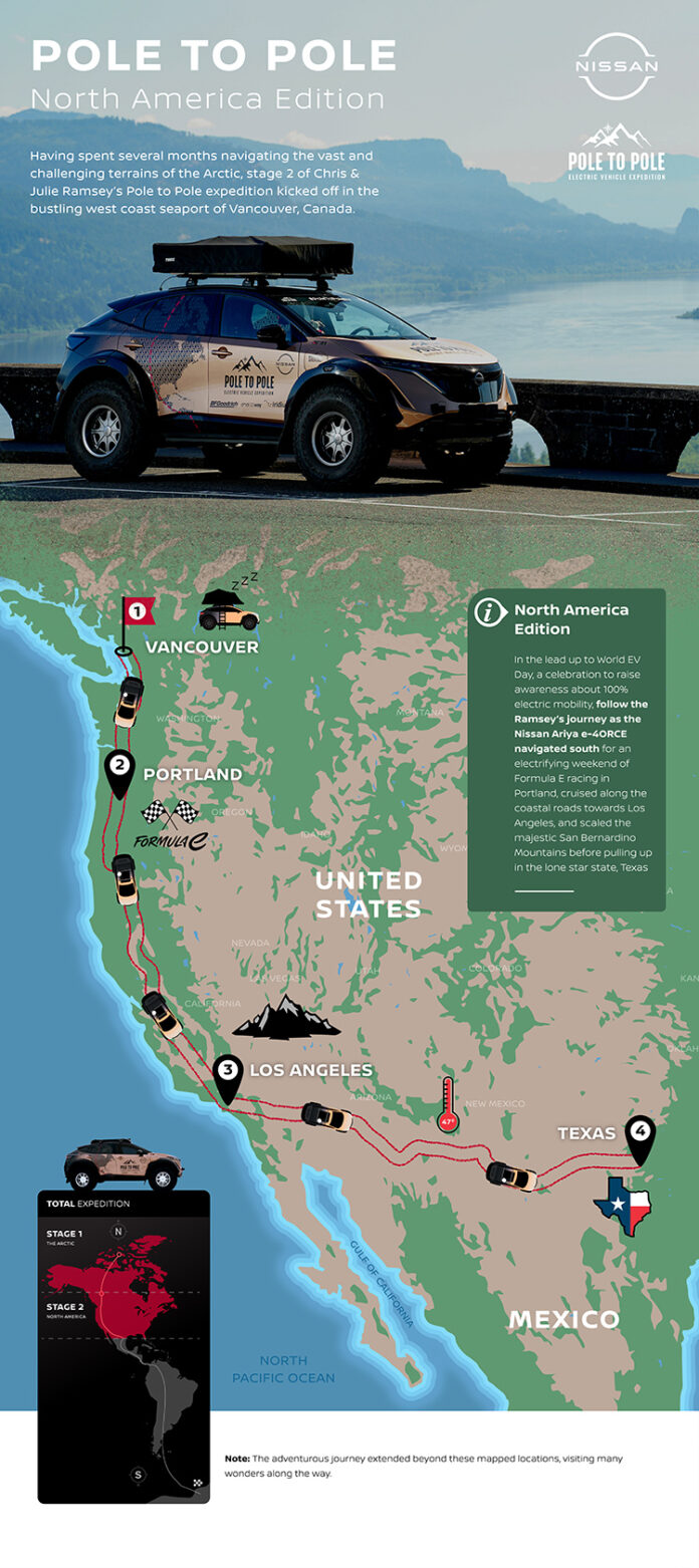 Las vías urbanas de Los Ángeles con sus largos tramos de autopista no fueron ningún desafío para la Expedición Ariya. Su tecnología e-4ORCE proporcionó a la pareja una experiencia de conducción urbana potente pero fluida y sin esfuerzo. El control y manejo superiores de Ariya requieren una corrección mínima de la dirección, lo que significa más tiempo para que el equipo Pole to Pole disfrute de su asiento de primera fila en la aventura de su vida.
